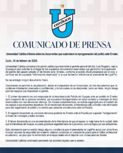 Universidad Católica asegura que no existieron riesgos y cuestiona la reprogramación ante Emelec