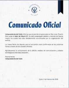 Independiente del Valle anunció oficialmente la postergación del amistoso ante Inter Miami que debía disputarse en San Juan, Puerto Rico,...