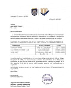 La Comisión Disciplinaria de la Federación Ecuatoriana de Fútbol (FEF) resolvió suspender en sus derechos al Club Sport Emelec debido...