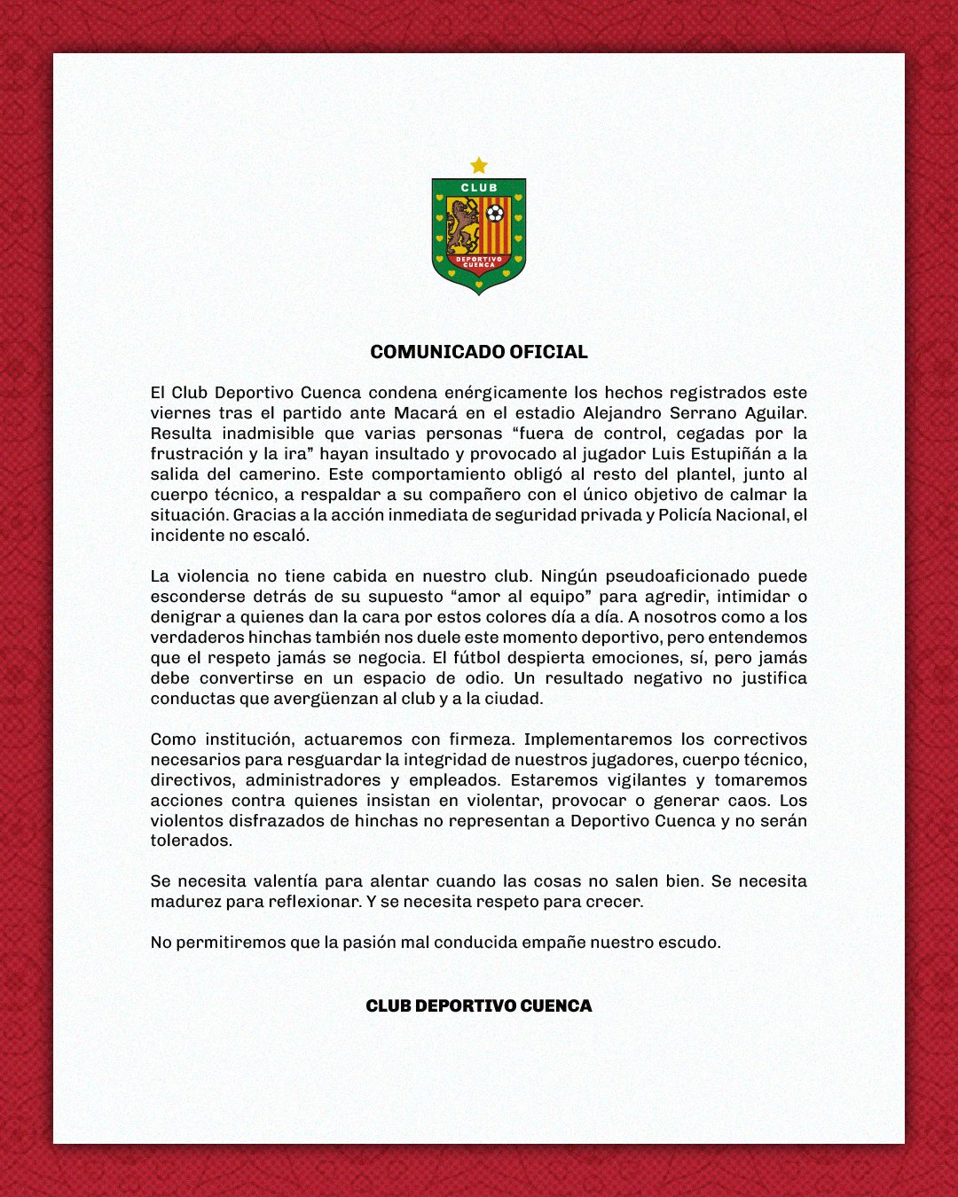 El Club Deportivo Cuenca emitió un comunicado oficial en el que rechazó enérgicamente los incidentes ocurridos luego del encuentro frente a Macará en el estadio Alejandro Serrano Aguilar. Según el pronunciamiento, varias personas “cegadas por la frustración y la ira” habrían insultado y provocado al jugador Luis Estupiñán al momento de salir del camerino, lo que generó la intervención del resto del plantel y del cuerpo técnico para calmar la situación. Gracias a la acción de seguridad privada y de la Policía Nacional, el hecho no pasó a mayores.