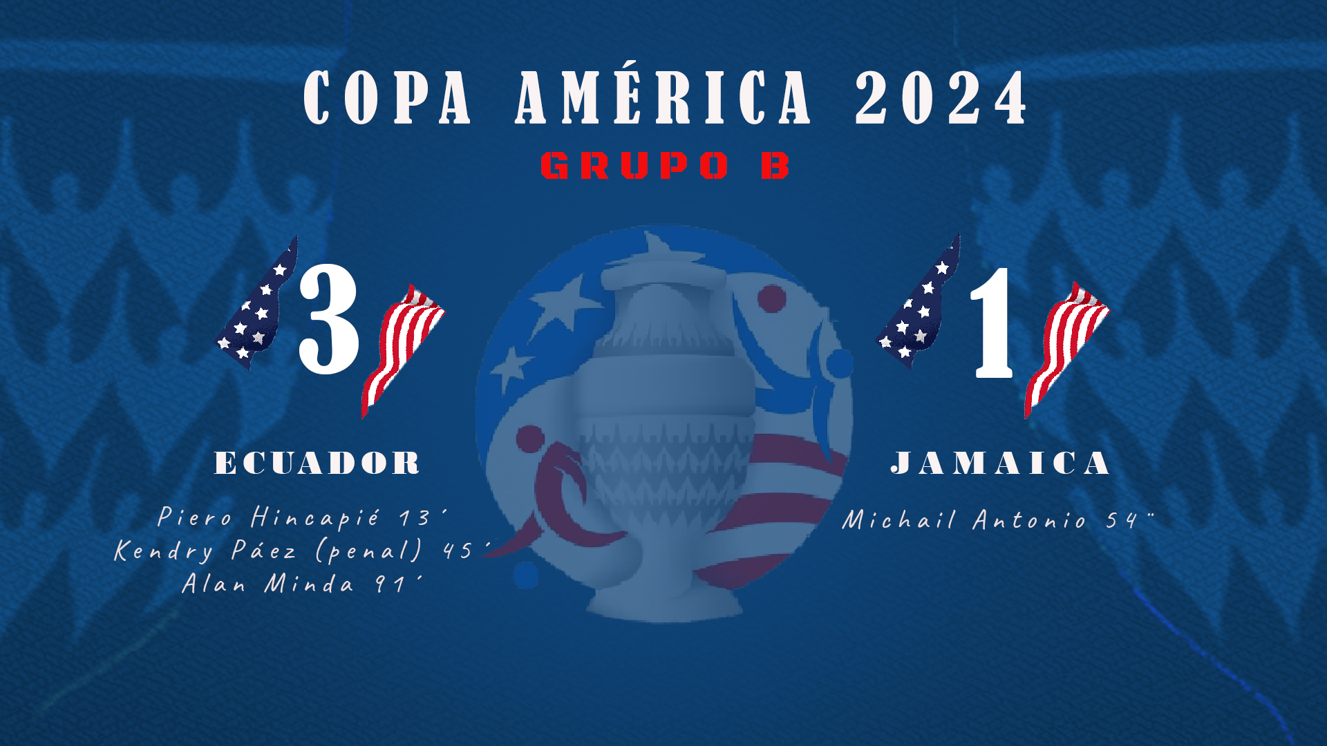 El equipo de Félix Sánchez Bas dominó el primer tiempo, anotando dos goles gracias a Piero Hincapié (13′) y Kendry Páez de penal (42′). En el segundo tiempo, Jamaica descontó a través de Michail Antonio (54′), pero Ecuador supo aguantar el resultado y sentenció el partido con un golazo de Alan Minda en el tiempo de descuento (91′).