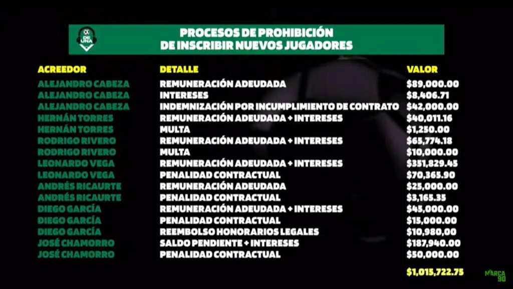 Las deudas corresponden a los casos de Alejandro Cabeza, Hernán Torres, Rodrigo Rivero, Leandro Vega, Andrés Ricaurte, “Demonio” García y José Chamorro. En conjunto, Emelec debe cancelar USD 1.015.000 únicamente para levantar las sanciones vigentes. No obstante, la cifra podría aumentar, pues el caso de Chamorro estaría ligado a situaciones adicionales relacionadas con Miller Bolaños y Bryan Angulo.