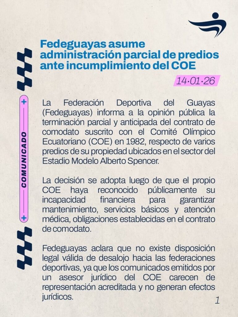 La Federación Deportiva del Guayas (Fedeguayas) anunció la terminación parcial y anticipada del contrato de comodato suscrito en 1982 con el Comité Olímpico Ecuatoriano (COE). Esta decisión se adoptó después de que el propio COE reconociera públicamente su incapacidad financiera para cumplir con las obligaciones contractuales de mantenimiento, servicios básicos y atención médica en los predios ubicados en el sector del Estadio Modelo Alberto Spencer. Fedeguayas aclaró que no existe una orden válida de desalojo hacia las federaciones, ya que comunicados previos de un asesor jurídico del COE carecían de representación acreditada y efectos legales.