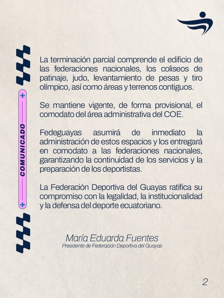 Finalmente, la Federación Deportiva del Guayas reafirmó su compromiso con la legalidad, la institucionalidad y la defensa del deporte ecuatoriano. La presidenta de la entidad, María Eduarda Fuentes, suscribió el comunicado en el que se ratifica esta posición, asegurando que la medida busca proteger los espacios deportivos y la normalidad de las actividades ante el incumplimiento contractual del COE.