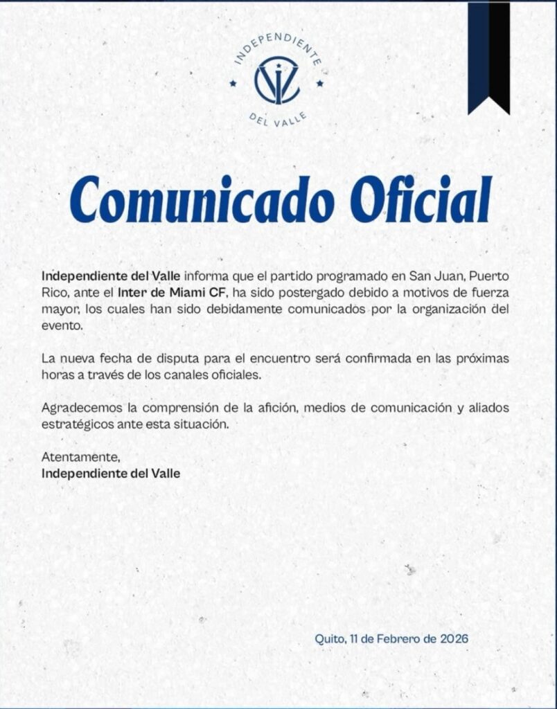 Independiente del Valle anunció oficialmente la postergación del amistoso ante Inter Miami que debía disputarse en San Juan, Puerto Rico, debido a motivos de fuerza mayor comunicados por la organización del evento. La decisión se da en medio de la preocupación por el estado físico de Lionel Messi, quien sufrió una distensión muscular en el isquiotibial izquierdo durante el duelo ante Barcelona SC en Guayaquil y no entrenó con normalidad en los últimos días. Para garantizar la presencia del astro argentino, principal atractivo de la gira, el encuentro sería reprogramado para el 26 de febrero en el mismo escenario.