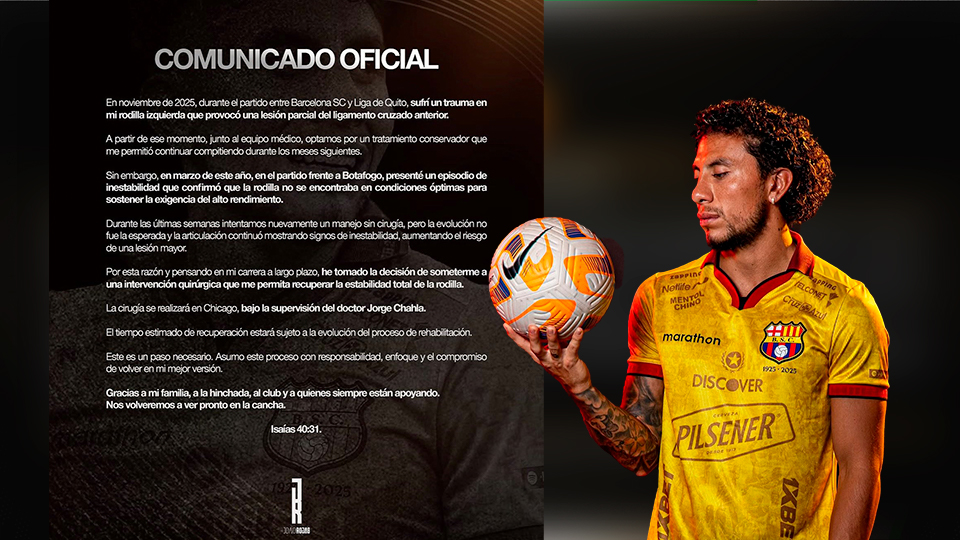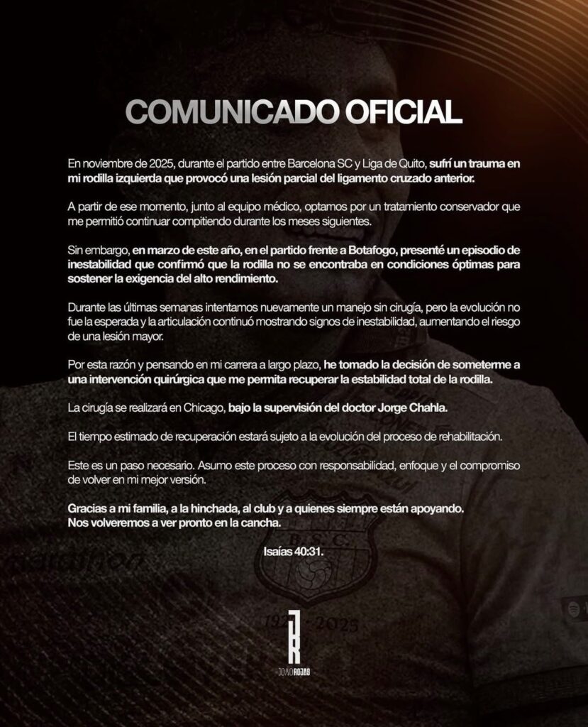 El futbolista ecuatoriano Joao Rojas confirmó que se someterá a una intervención quirúrgica en su rodilla izquierda, luego de arrastrar una lesión parcial del ligamento cruzado anterior desde noviembre de 2025. El jugador sufrió el trauma durante un partido entre Barcelona SC y Liga de Quito, y pese a intentar un tratamiento conservador, la molestia persistió y afectó su rendimiento.