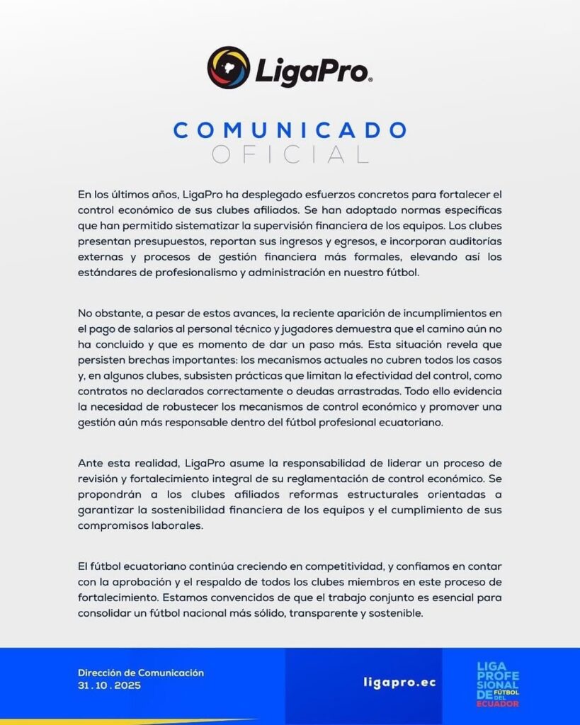 La LigaPro emitió un comunicado oficial en el que destacó los esfuerzos realizados durante los últimos años para reforzar el control económico de los clubes afiliados. Según el organismo, se han implementado normas que permiten supervisar de manera más sistemática las finanzas de los equipos, incluyendo la presentación de presupuestos, auditorías externas y reportes financieros formales. Estas acciones, asegura la institución, han elevado los estándares de profesionalismo y administración dentro del fútbol nacional.