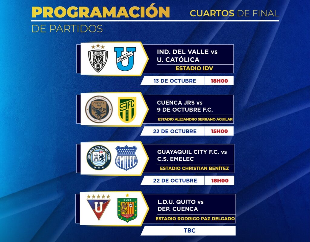 La Federación Ecuatoriana de Fútbol confirmó el calendario de los cruces, con excepción del duelo entre Liga de Quito y Deportivo Cuenca, que aún no tiene fecha definida debido a los compromisos internacionales del conjunto albo. Los demás partidos se jugarán a partido único: Independiente del Valle recibirá a Universidad Católica el 13 de octubre; Cuenca Juniors enfrentará a 9 de Octubre el 22 de octubre en el Serrano Aguilar; y Guayaquil City se medirá ante Emelec ese mismo día en el estadio Christian Benítez.