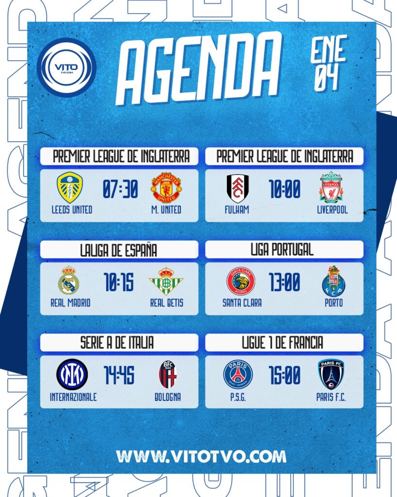 Agenda Deportiva Partidos destacados del domingo 4 de enero Eduardo D'Achiardi 4 de enero de 2026 0 Deja una respuesta Cancelar la respuestaTu dirección de correo electrónico no será publicada. Los campos obligatorios están marcados con *Comentario * Nombre * Correo electrónico * Web Guarda mi nombre, correo electrónico y web en este navegador para la próxima vez que comente.