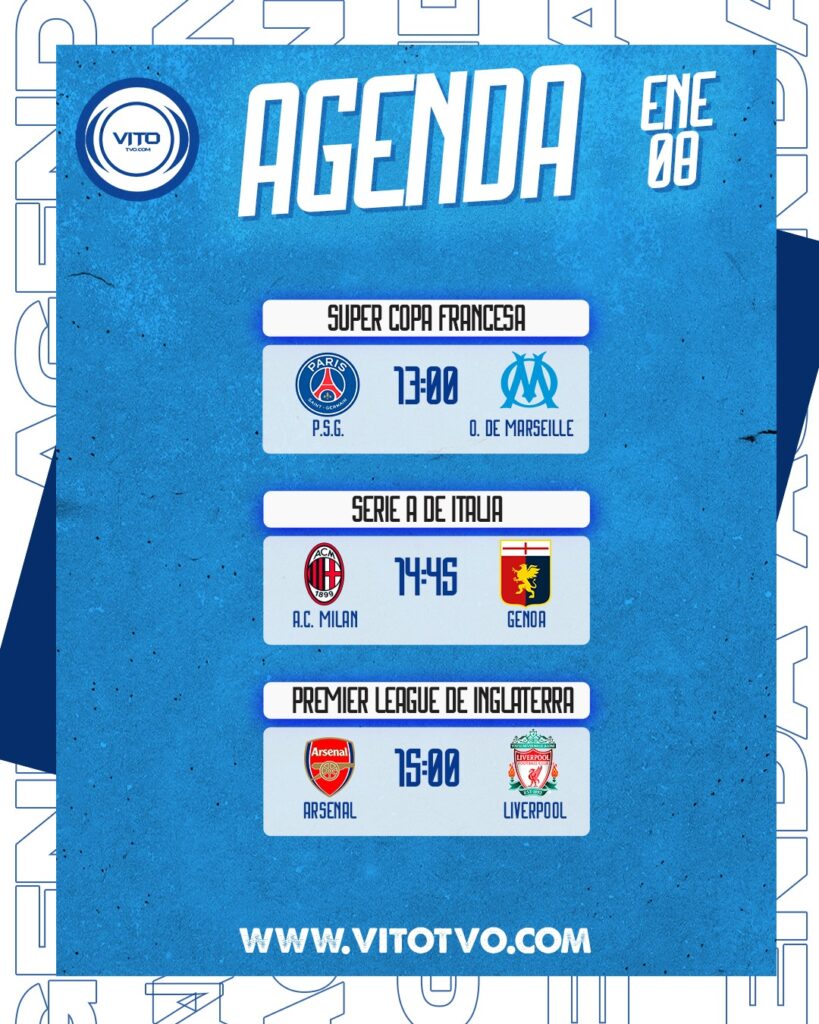 Agenda Deportiva Partidos destacados del jueves 8 de enero Eduardo D'Achiardi 8 de enero de 2026 0 Deja una respuesta Cancelar la respuestaTu dirección de correo electrónico no será publicada. Los campos obligatorios están marcados con *Comentario * Nombre * Correo electrónico * Web Guarda mi nombre, correo electrónico y web en este navegador para la próxima vez que comente.