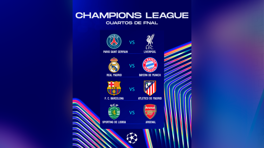 Los enfrentamientos de cuartos quedaron definidos sin necesidad de sorteo adicional, siguiendo el nuevo formato de la UEFA que establece el cuadro completo hasta la final. En el lado izquierdo, PSG se medirá al Liverpool, repitiendo el cruce de la temporada pasada, mientras que Bayern de Múnich y Real Madrid protagonizarán uno de los clásicos más frecuentes en la historia de la competición. En el otro sector, Barcelona enfrentará al Atlético de Madrid y Sporting de Lisboa al Arsenal. Los partidos de ida se jugarán el 7 y 8 de abril, y los de vuelta el 14 y 15 de abril.