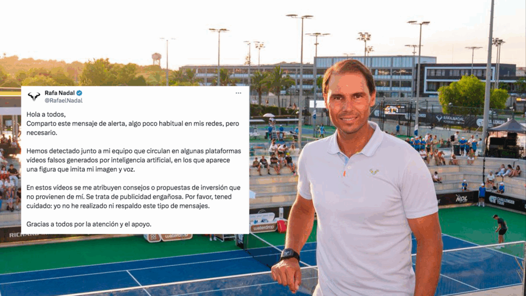 Rafael Nadal utilizó sus redes sociales para advertir a sus seguidores sobre la circulación de videos falsos generados con inteligencia artificial. En estos materiales se imita su imagen y voz para difundir supuestos consejos o propuestas de inversión que, según aclaró, no provienen de él.