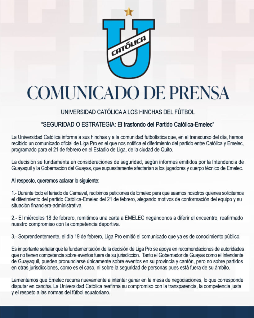 La Universidad Católica emitió un comunicado de prensa en el que se pronuncia sobre el diferimiento del partido ante Club Sport Emelec, programado para el 21 de febrero en Quito. El club capitalino señaló que recibió la notificación oficial por parte de la LigaPro, la cual justificó la decisión en consideraciones de seguridad basadas en informes de autoridades de Guayas.